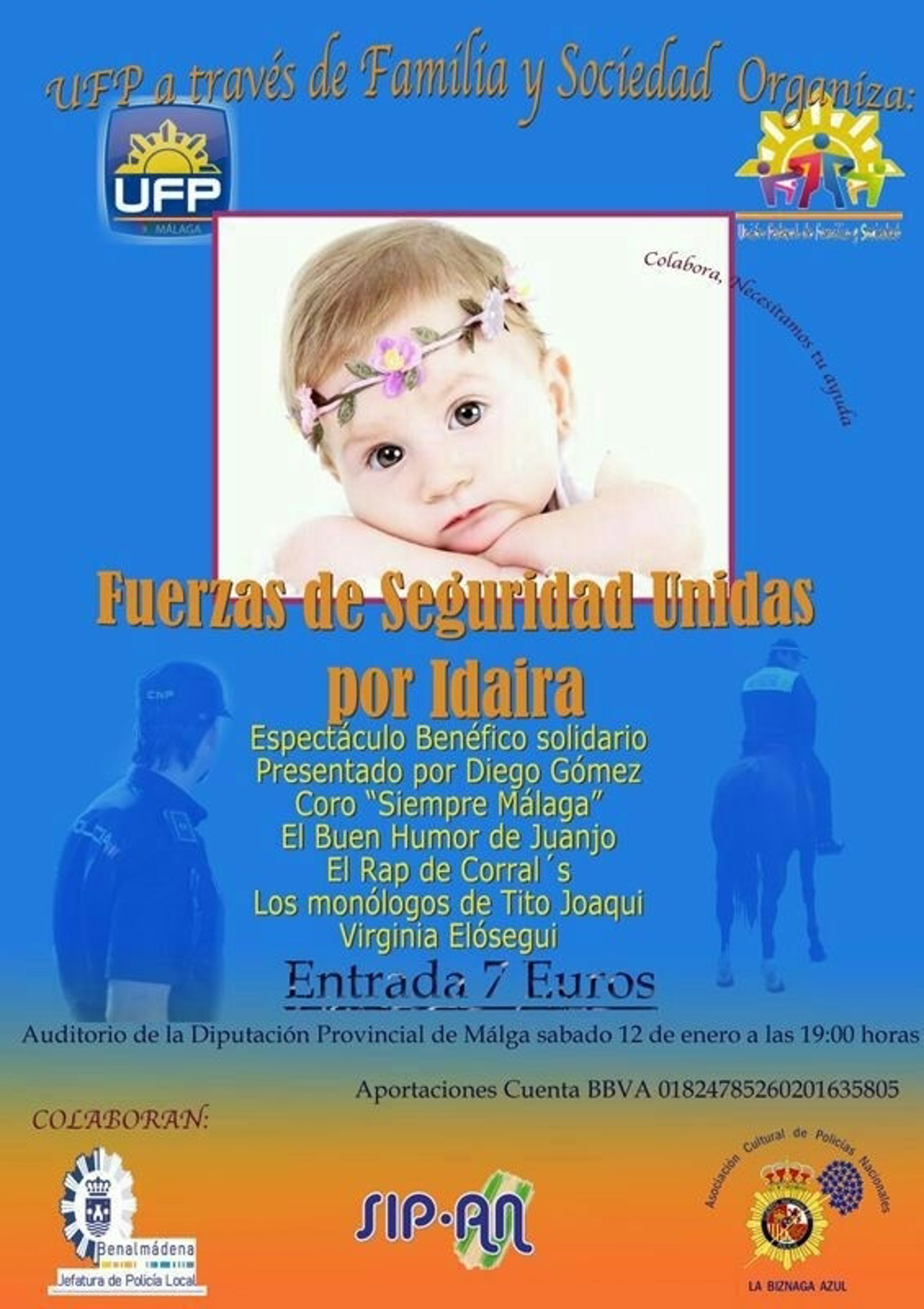 'Las Fuerzas de Seguridad unidas por Idaira' fue presentado por Diego Gómez e incluyó las actuaciones del coro Siempre Málaga, el humorista Juanjo, el Rap de Corral's, las cantantes Virginia Elósegui y Virginia Alexandre y el monologuista Tito Joaqui.