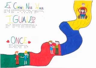Con el título escrito a tinta y braille, el cartel ganador en la categoría B representa a varios chicos y chicas, con y sin discapacidad, que van subiendo su autoestima a medida que avanzan por un camino, jugando con los colores corporativos del Grupo Social ONCE. "Hemos querido representar la vida como si fuera un camino y todos estamos en él colaborando y ayudándonos", subrayan los ganadores.
