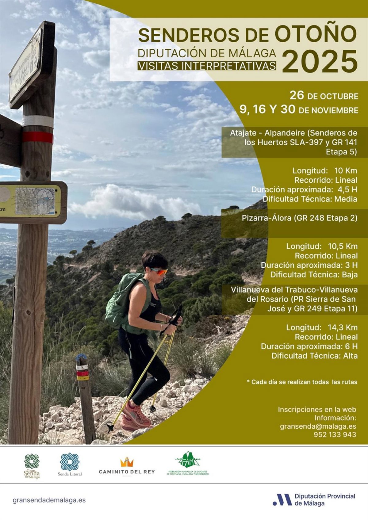 Más de 600 personas podrán disfrutar de las rutas de senderismo que la Diputación de Málaga oferta para los meses de octubre y noviembre. El programa de esta temporada incluye un sendero de dificultad baja entre Pizarra y Álora, uno de dificultad media de entre Atajate y Alpandeire, y uno de dificultad alta entre Villanueva del Trabuco y Villanueva del Rosario.