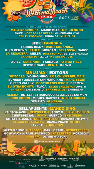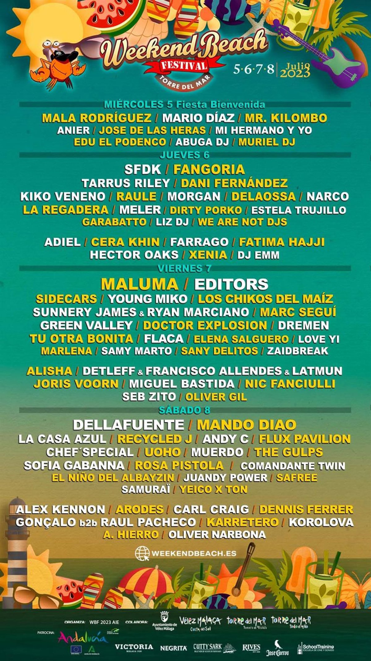 Más de 85 propuestas musicales conforman el cartel de la octava edición del Weekend Festival Torre del Mar (Vélez-Málaga) que se celebra entre el 5 y el 8 de julio y que, entre otras, presenta actuaciones de bandas y artistas como Mala Rodríguez, Díaz, SFDK, Fangoria, Dellafuente, Carl Craig, Maluma y Editors.