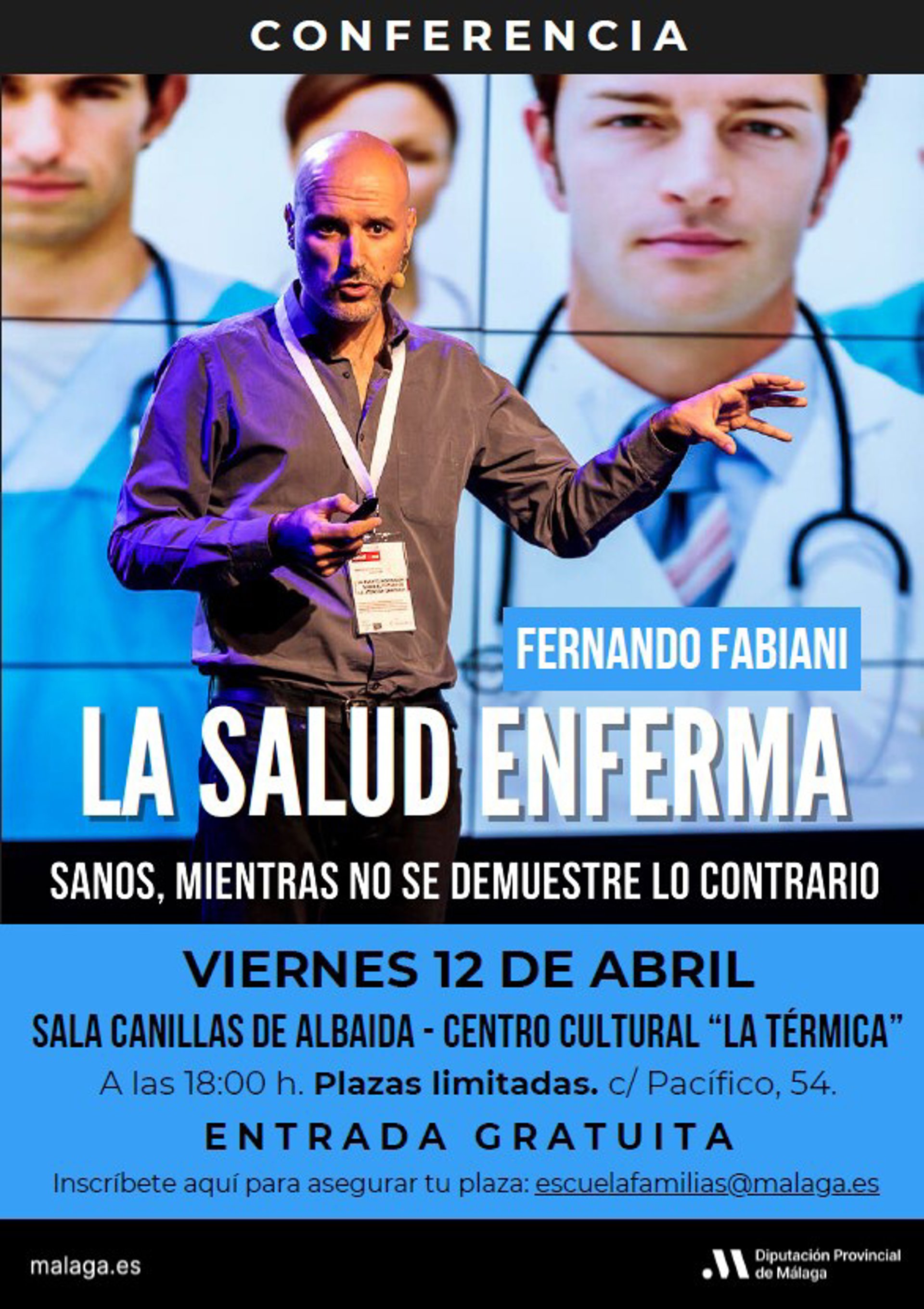 La Escuela Provincial de Familias de la Diputación de Málaga organiza una conferencia del médico, divulgador y escritor Fernando Fabiani dentro del ciclo de actividades. La charla se celebrará el viernes 12 de abril, a partir de las 18.00 horas, en la sala Canillas de Albaida del Centro Cultural La Térmica.