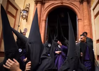 Hermanos de la Hermandad de San Bernardo se marchan de la parroquia tras suspenderse por la lluvia su estación de penitencia, a 27 de marzo de 2024, en Sevilla, Andalucía (España). - María José López - Europa Press