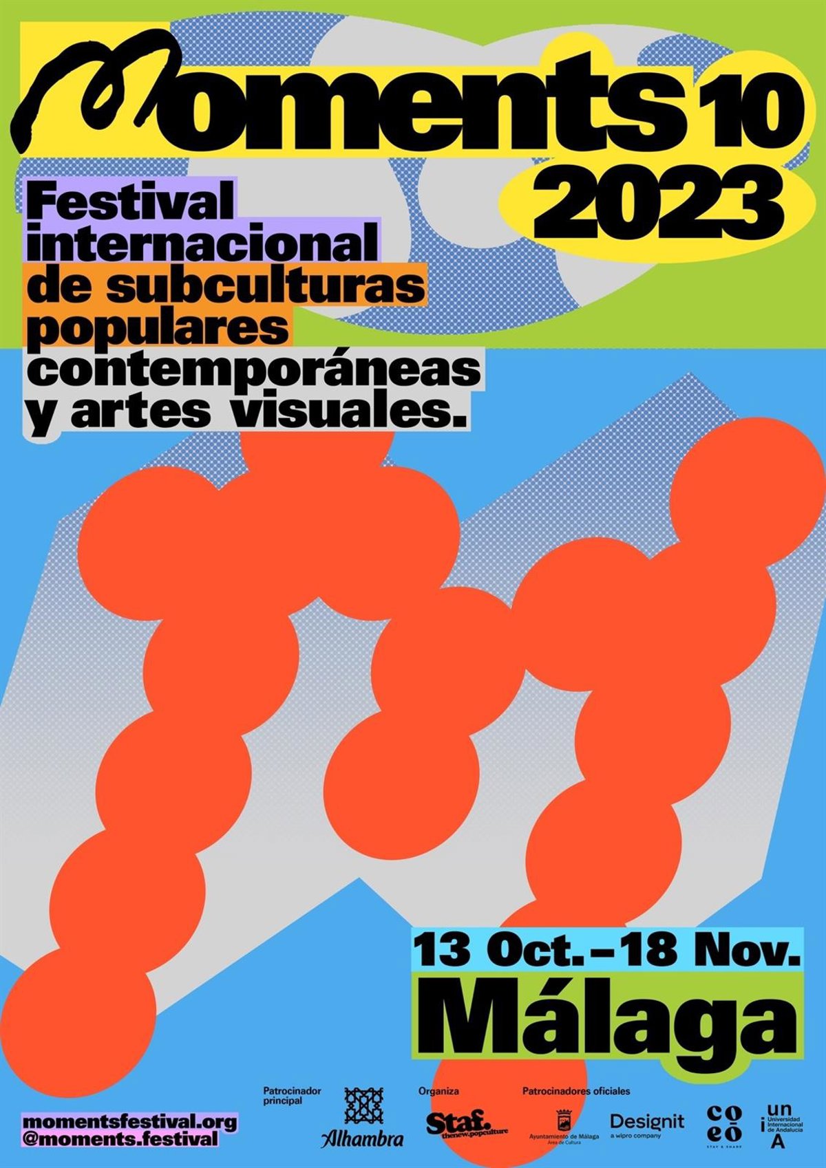 El Festival Internacional de SubCulturas Populares Contemporáneas & Artes Visuales, Moments Festival celebra este otoño con el patrocinio principal de Cervezas Alhambra y el apoyo del Área de Cultura del Ayuntamiento de Málaga su décima edición con un intenso y atractivo programa de más de 180 actividades, la mayoría gratuitas, con alrededor de 300 artistas internacionales y nacionales que llenarán Málaga, Sevilla y Madrid, de lo más destacado del arte urbano, la fotografía, el diseño, la ilustración, la música, el cine, la artesanía, el skateboard, el surf y las artes escénicas.