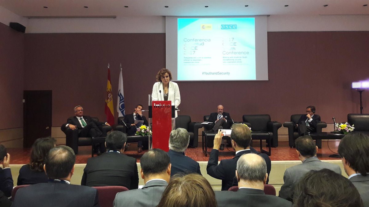 La ministra de Sanidad, Servicios Sociales e Igualdad, Dolors Montserrat, ha participado este jueves en la inauguración de la conferencia 'Juventud y Seguridad OSCE 2017' en Mollina (Málaga), donde ha afirmado que "la juventud es una fuente de oportunidades que bajo los liderazgos equivocados pueden convertirse en amenazas". "Las decisiones que tomen los jóvenes afectan al futuro de la sociedad, la manera en la que practiquen el respeto, la tolerancia, la igualdad y la diversidad entre ellos marca el futuro de las sociedades", ha añadido.