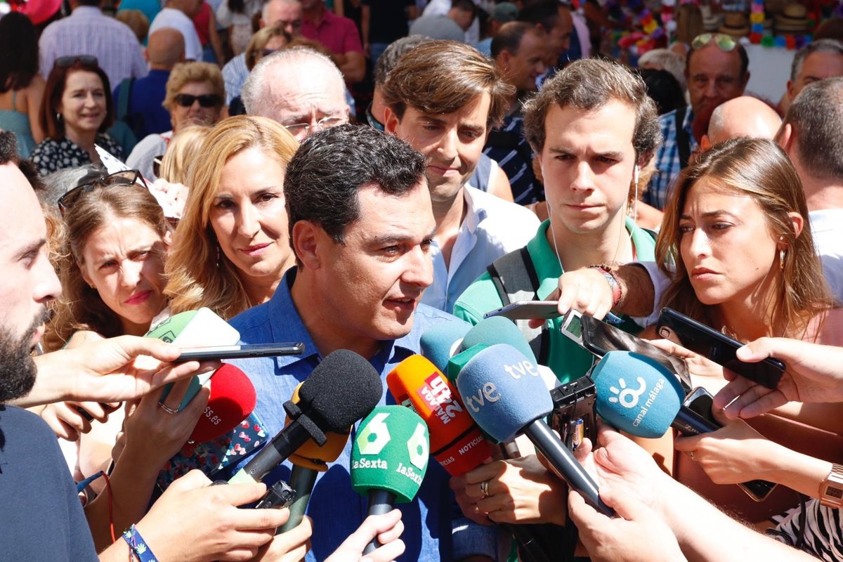 El presidente de la Junta de Andalucía, Juanma Moreno, atiende a los medios de comunicación en la Feria de Málaga - ÁLEX ZEA/EUROPA PRESS