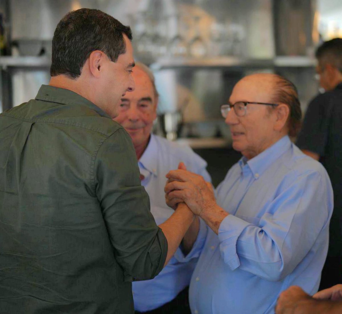 El presidente de la Junta de Andalucía, Juanma Moreno, saluda a 'Fosforito' en la imagen que Moreno ha usado en la publicación en redes en la que lamenta la muerte del famoso artista flamenco. - PERFIL EN 'X' DE JUANMA MORENO