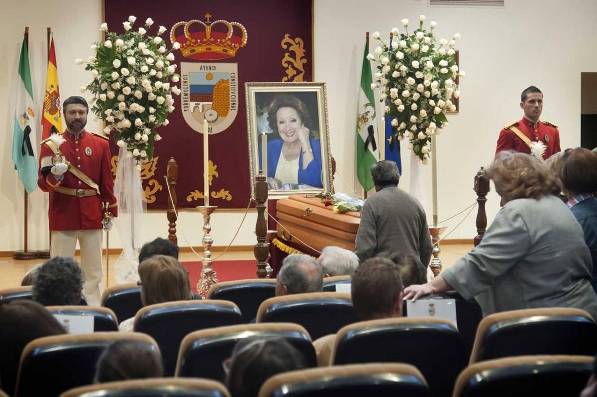 El Salón de Plenos del Ayuntamiento de Torremolinos ha registrado durante toda la mañana un intenso trasiego de personas que, además de mostrar sus respetos y condolencias a los familiares de la artista, también, en algunos casos, han depositado flores sobre el féretro, presidido por una foto de la artista, escoltado en todo momento por dos agentes de la Policía Local con uniforme de gala y flanqueado también por cuatro cirios.