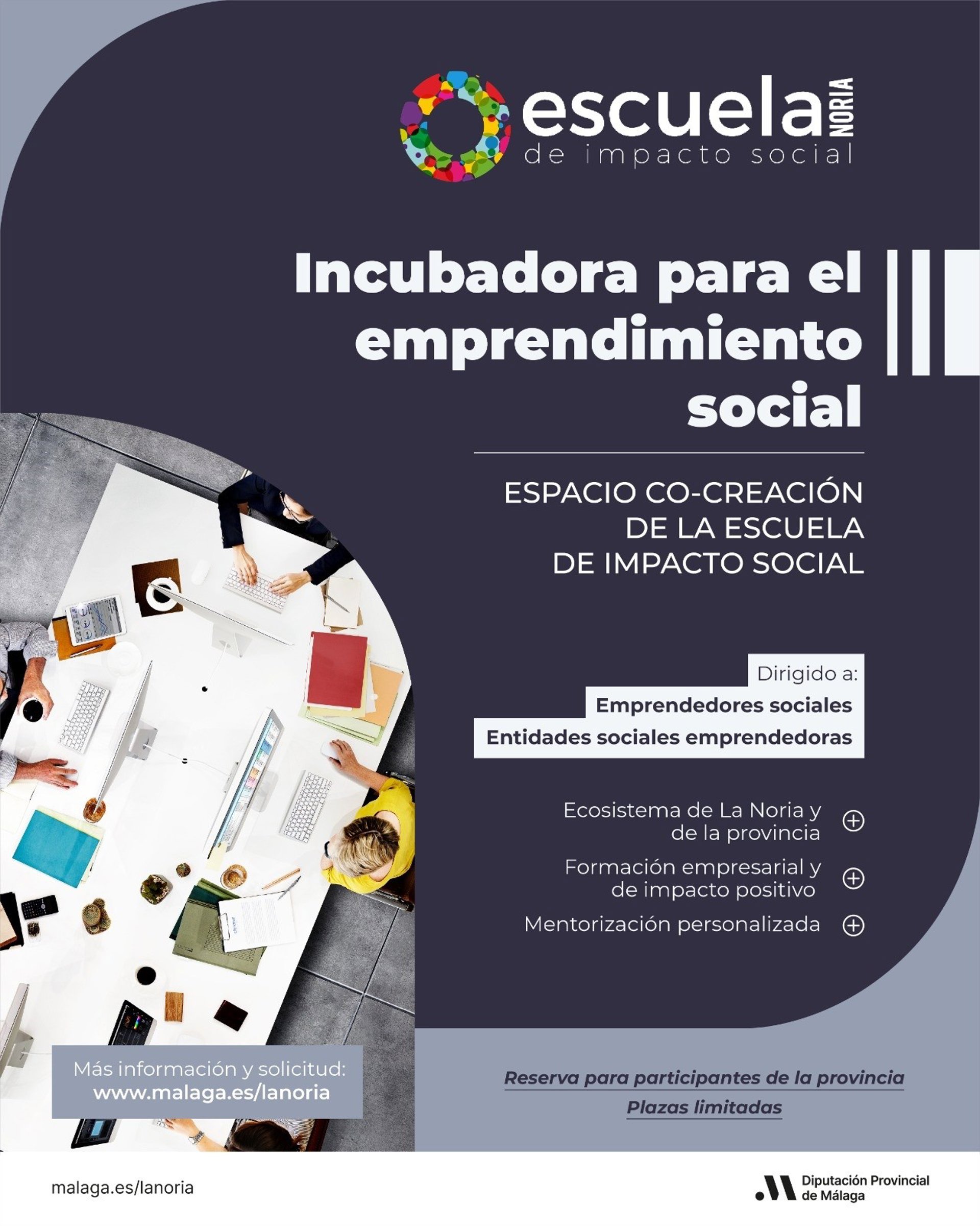 El centro de innovación social La Noria de la Diputación de Málaga abre una nueva convocatoria de la Incubadora de Emprendimiento Social de la Escuela de Impacto, donde un total de 20 ideas de negocio o iniciativas emprendedoras se beneficiarán de un programa especializado y se convertirán en proyectos de emprendimiento social y proyectos empresariales sostenibles económicamente que satisfagan necesidades sociales.