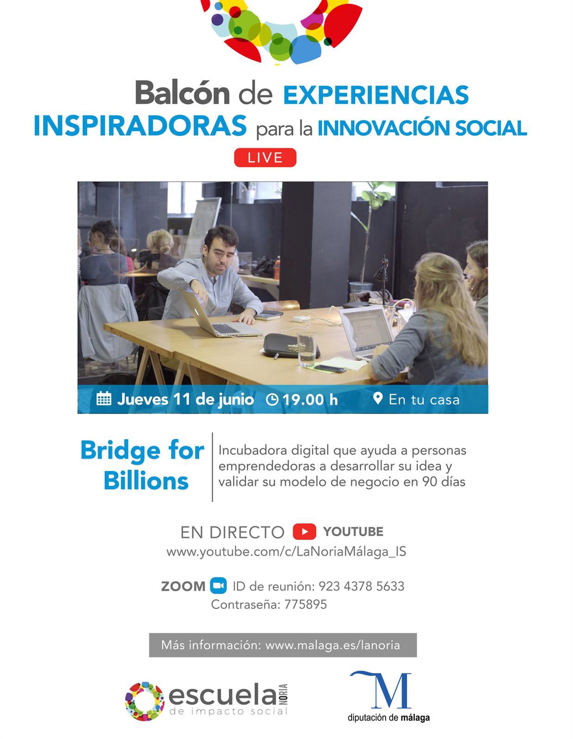 El jueves 11 a las 19.00 horas será el turno de Bridge for Billions, una incubadora digital que ayuda a las personas emprendedoras en fases iniciales a desarrollar su idea y validar su modelo de negocio en 90 días de la mano de mentores profesionales. Trabaja por la democratización del acceso a la formación y mentoría para emprendedores de cualquier rincón del mundo, especialmente en zonas rurales o de difícil acceso a estos recursos.