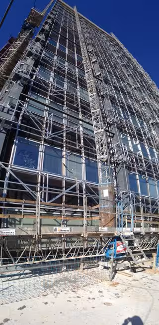 Las 'jaulas' o estructura auxiliar que soporta los paneles exteriores ya están prácticamente terminadas y se ha empezado a colocar la estructura auxiliar de anclaje del 'composite', material creado con doble chapa de aluminio e interior de resinas. En breve plazo se empezará a colocar el aislamiento y la segunda envolvente que cerrara la fachada por completo; de hecho, ya se están realizando algunas pruebas al respecto.