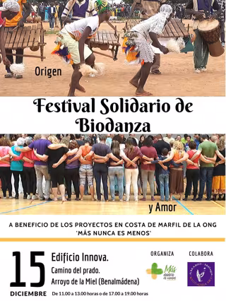 La plataforma 'Más nunca es menos' ha organizado, en colaboración con Asociación de Biodanza de Málaga (Amabio), un Festival Solidario de Biodanza a favor de los proyectos sociales que la primera tiene en marcha en Costa de Marfil, en concreto en la ciudad de Korhogo. Será este domingo en el edificio Innova de Arroyo de la Miel, en Benalmádena (Málaga).