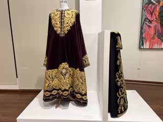 La muestra exhibe piezas emblemáticas del patrimonio de la hermandad, como estandartes y mazas todas ellas con elementos decorativos que aluden al vino: pámpanos, racimos de uvas, hojas de parra y tonos burdeos, entre otros. - CRDO MÁLAGA, SIERRAS DE MÁLAGA Y PASAS DE MÁLAGA