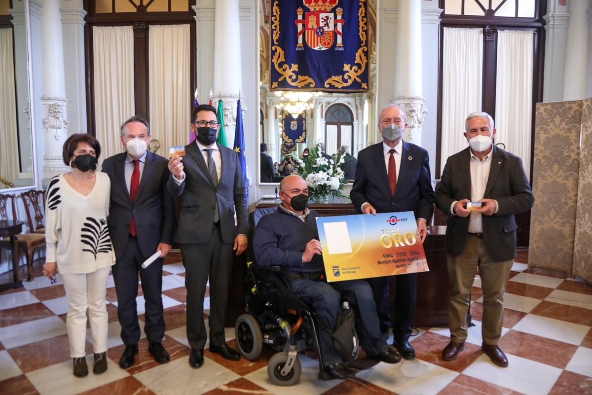 El alcalde, Francisco de la Torre, acompañado de los concejales de Movilidad y de Derechos Sociales, José del Río y Francisco Pomares, respectivamente, y del presidente de la Agrupación de Desarrollo Málaga Accesible, Alfredo de Pablos, ha presentado este martes las novedades que incorporará la Tarjeta Oro de la Empresa Malagueña de Transportes (EMT), de la que se podrán beneficiar personas con discapacidad.