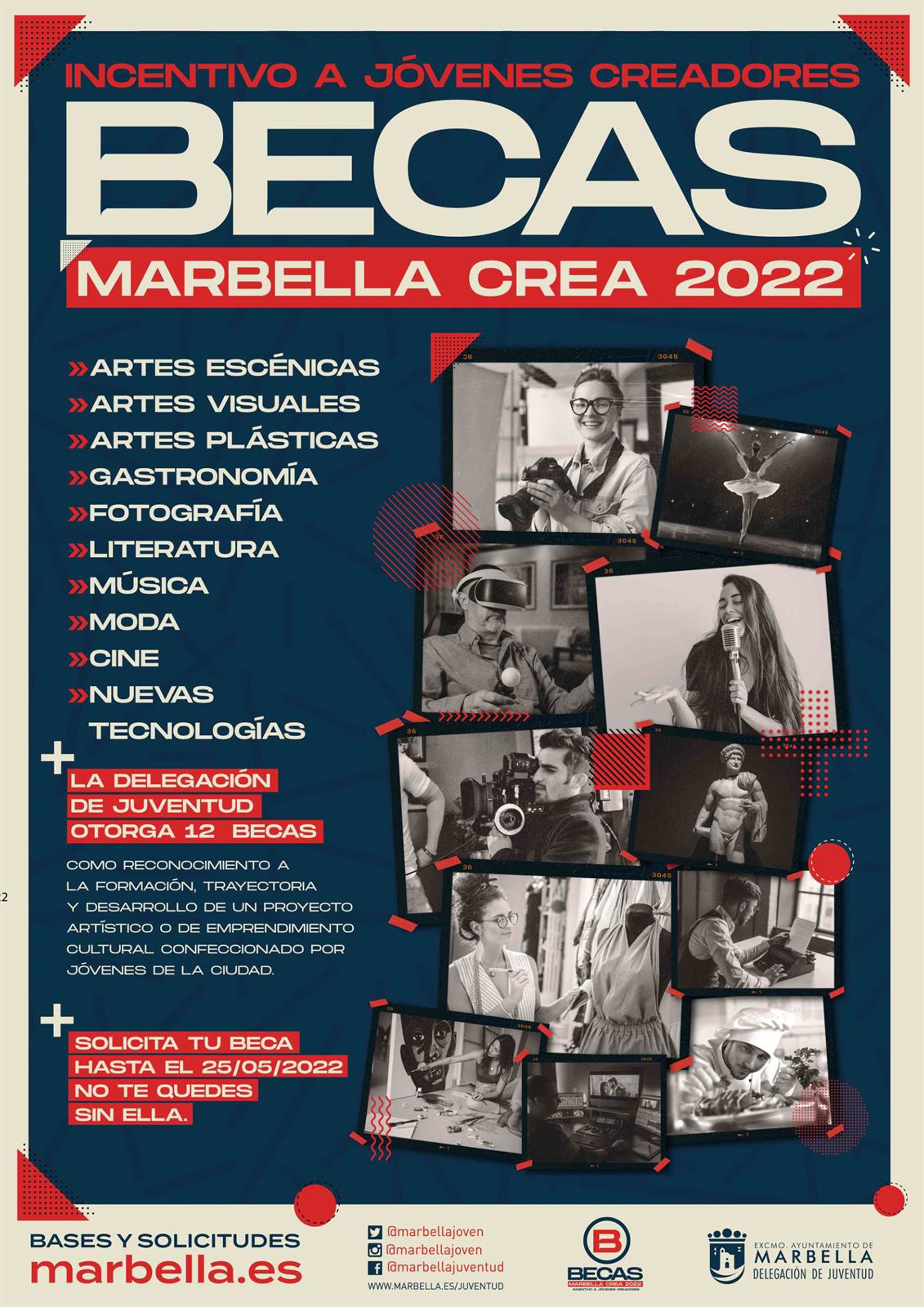 El plazo de inscripción para optar a las becas del certamen 'Marbella Crea 2022' finaliza este miércoles, según ha recordado la delegación municipal de Juventud, que organiza esta iniciativa con el objetivo de promocionar e impulsar la cultura y el arte de los jóvenes talentos del municipio.
