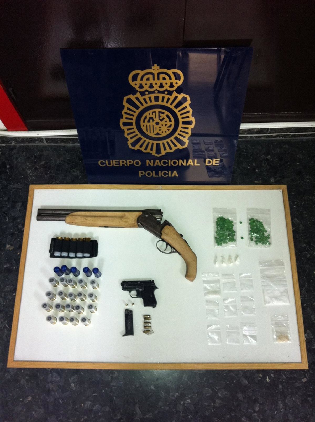 En el registro de la vivienda, los policías intervinieron 164 comprimidos de éxtasis; 28 dosis de MDMA, preparada en bolsitas de plástico transparente para su posterior venta; un machete tipo militar, de 23 centímetros de hoja; una escopeta de doble cañón del calibre 12 milímetros; una canana de cordura con cinco cartuchos, así como otros 24 de postas.
