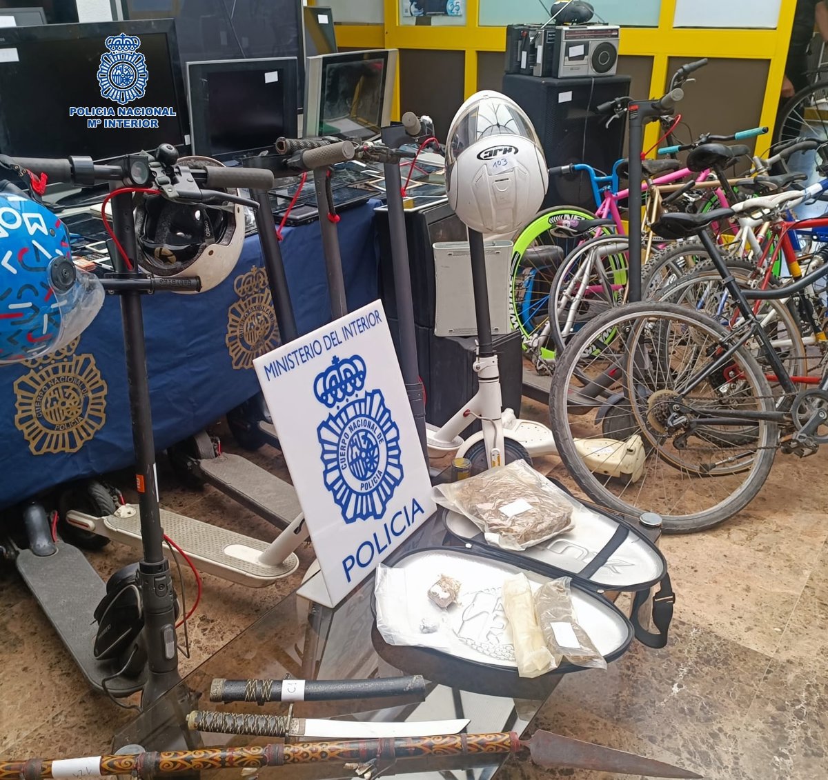 En la entrada y registro efectuada en los dos centros de receptación de objetos robados, los agentes intervinieron 19 bicicletas, siete patinetes eléctricos, diez televisiones, 35 tablet, casi un centenar de teléfonos móviles, 500 gramos de marihuana, 42 gramos de hachís y 53 billetes de monedas extranjeras.