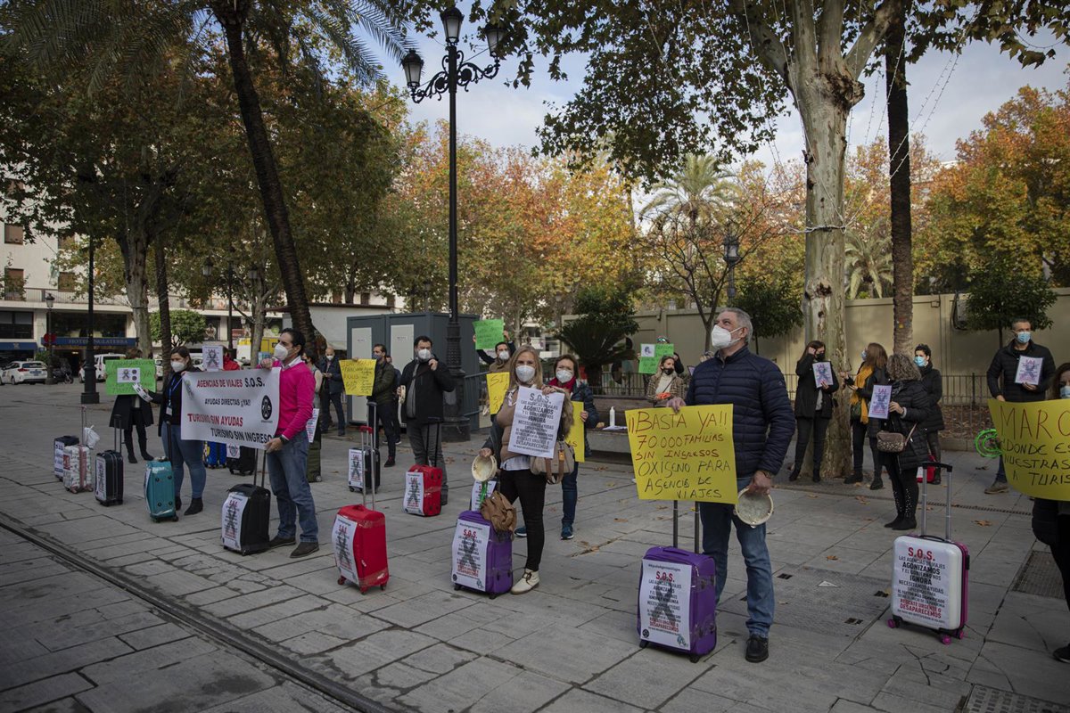 Archivo - Asociaciones representativas de las agencias de viajes y grupos de agentes concentrados en la Plaza Nueva para reclamar al Gobierno medidas para paliar las pérdidas de un sector que se considera "olvidado" por la Administración. En Sevilla (An - María José López - Europa Press - Archivo