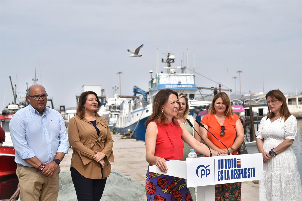 La presidenta del PP de Málaga, Patricia Navarro, junto a la candidata a las elecciones europeas Carmen Crespo y el presidente local y alcalde de Vélez-Málaga, Jesús Lupiáñez, en un encuentro con representantes del sector pesquero de la localidad. - PP MÁLAGA