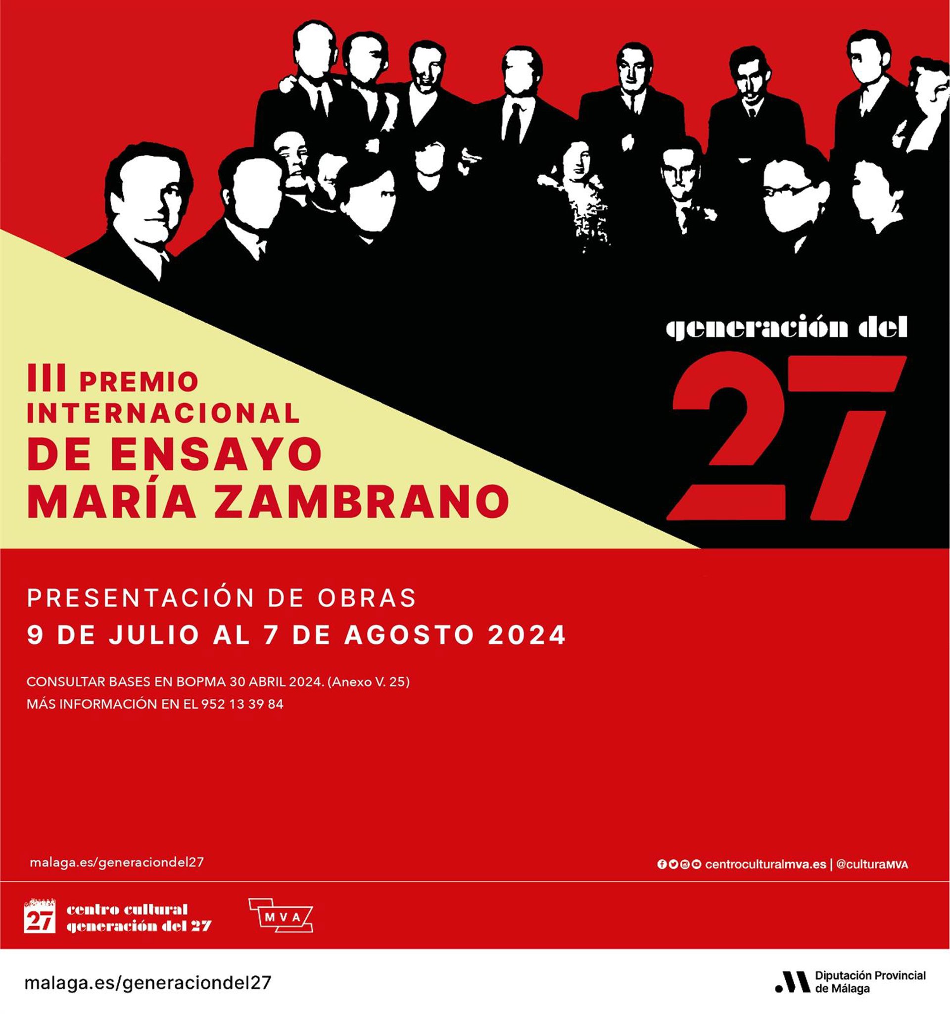 Las bases del III Premio Internacional de Ensayo María Zambrano se publicaron en el Boletín Oficial de la Provincia del 30 de abril de 2024, y la convocatoria se ha publicado en BOPMA de ayer lunes, 8 de julio.