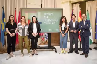 La concejala delegada de Cultura y Patrimonio Histórico, Mariana Pineda, junto al responsable territorial en Andalucía, Ceuta y Melilla de Fundación 'la Caixa', Juan Carlos Barroso; las autoras del documental premiado Delia Martínez y Toñi Martín; y la directora y protagonista de la pieza teatral 'La buena obra', Luz Arcas, ha presentado el proyecto ganador del certamen, que tiene por objetivo fomentar el tejido productivo local.