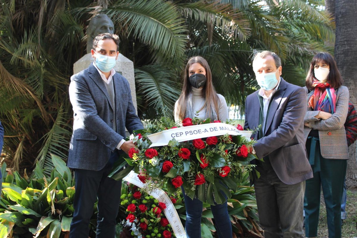 El secretario general electo del PSOE de Málaga, Daniel Pérez, ha participado este jueves en la tradicional ofrenda floral al fundador del partido, Pablo Iglesias Posse con motivo del 96 aniversario de su fallecimiento, junto al secretario general del partido, José Luis Ruiz Espejo, y a la secretaria general de las Juventudes Socialistas de Málaga, Ana Villarejo.