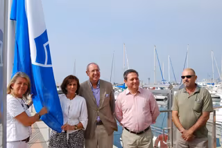 Los delegados provinciales del Gobierno andaluz y de Obras Públicas y Vivienda, Remedios Martel y Enrique Benítez, respectivamente, junto con la alcaldesa del municipio, Ángeles Muñoz, han presidido este miércoles la izada de la bandera azul en esta dársena marbellí.