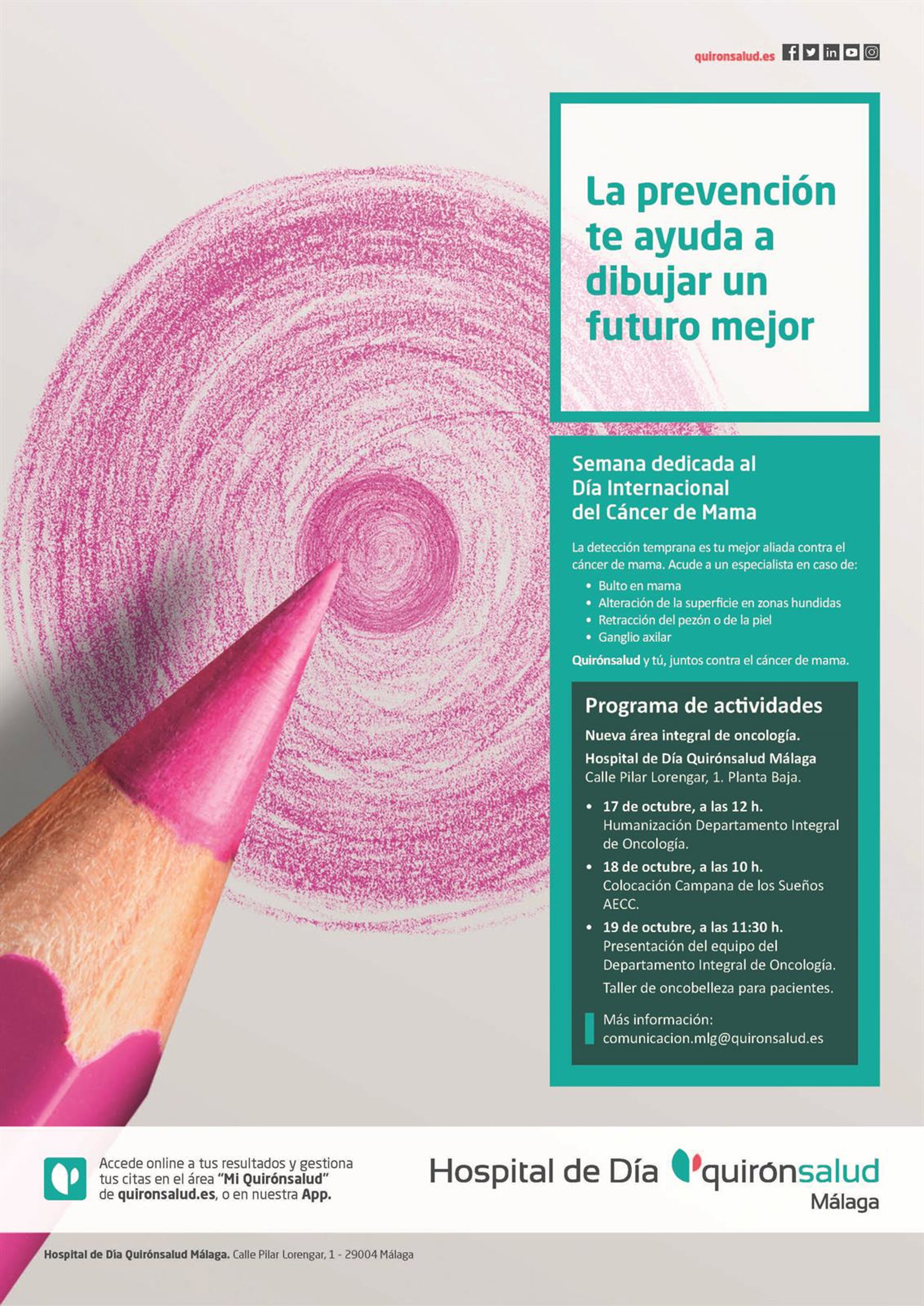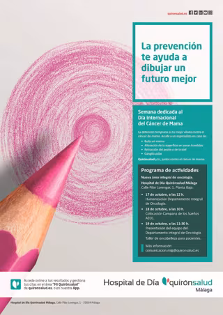 El Hospital Quirónsalud Málaga conmemora el próximo Día Internacional del Cáncer de Mama con distintas actividades la próxima semana, abiertas al público general y especialmente dedicadas a las pacientes, con el fin de ofrecer apoyo e información necesaria, así como fomentar la prevención y el diagnóstico precoz tan fundamental para la supervivencia.