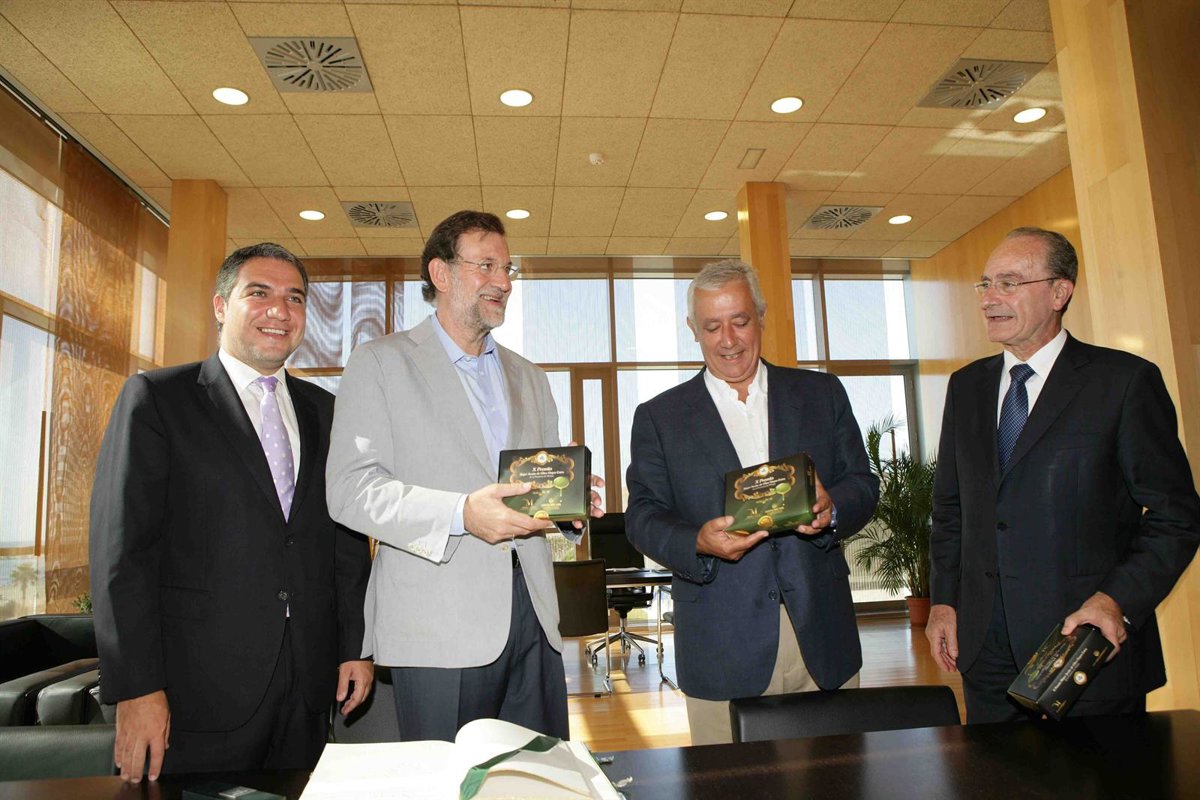 Una vez en la sede de la Diputación, el líder nacional del PP ha firmado el libro de honor de esta administración, tras lo cual ha sido obsequiado, al igual que Arenas y De la Torre, con aceite de oliva virgen de la localidad malagueña de Fuente de Piedra.