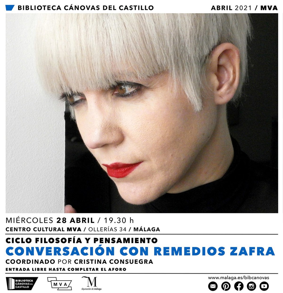 El Centro Cultural MVA de la Diputación de Málaga será escenario de la sesión de clausura del I Ciclo 'Filosofía y Pensamiento', que tendrá lugar el próximo miércoles 28 de abril, a las 19.30 horas, y contendrá el coloquio entre la escritora y filósofa, Remedios Zafra, y Cristina Consuegra, coordinadora del ciclo, sobre el ensayo 'Frágiles'.