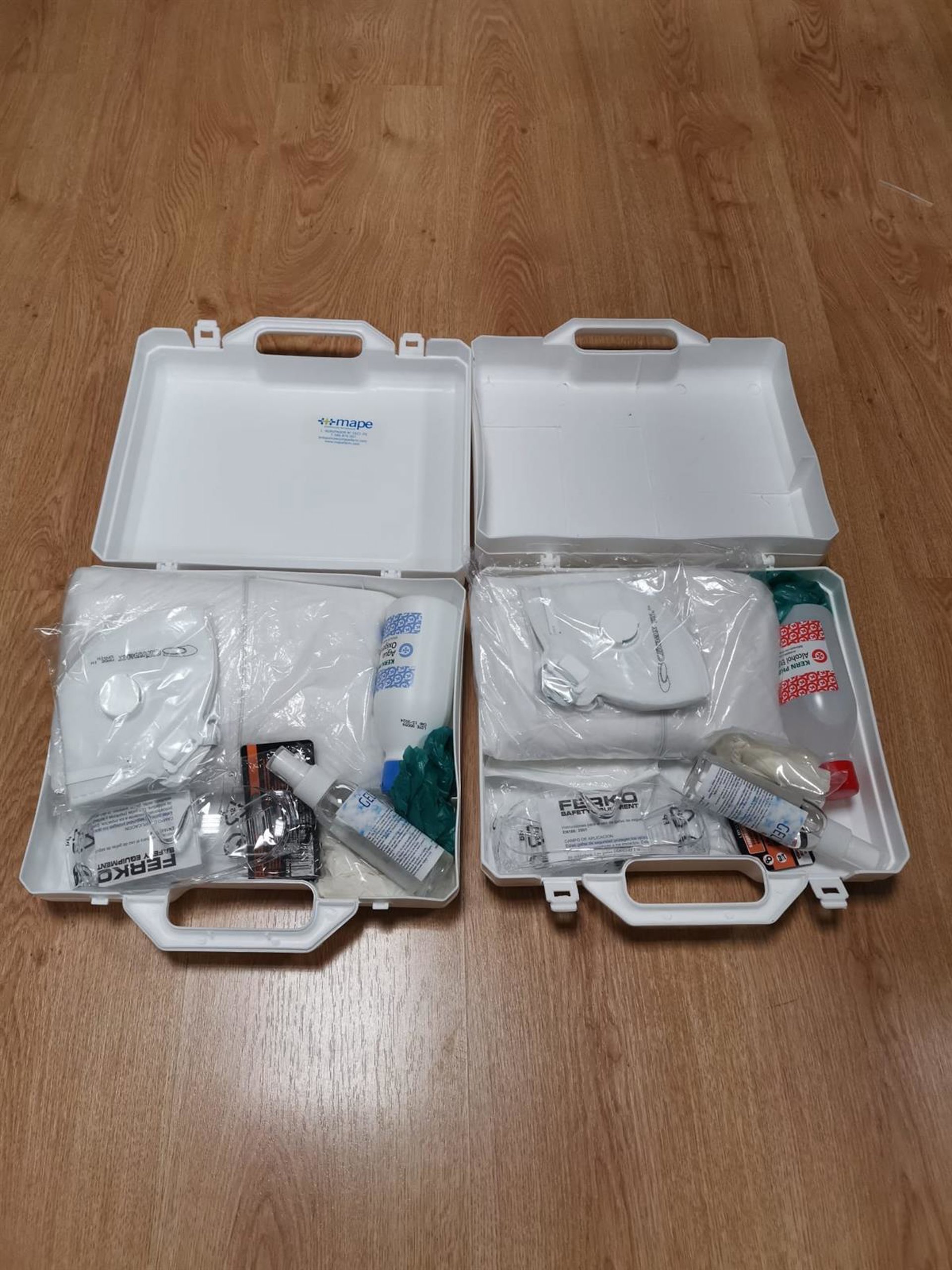 Estos maletines cuentan con traje sanitario desechable, gafas de protección, guantes quirúrgicos, mascarillas, gel hidroalcóholico, protector de calzado, alcohol y gafas. Los kits se encuentran precintados y en caso de uso se realizará su rápida reposición. Además, todos los agentes disponen de guantes, mascarillas, geles desinfectantes, etcétera.
