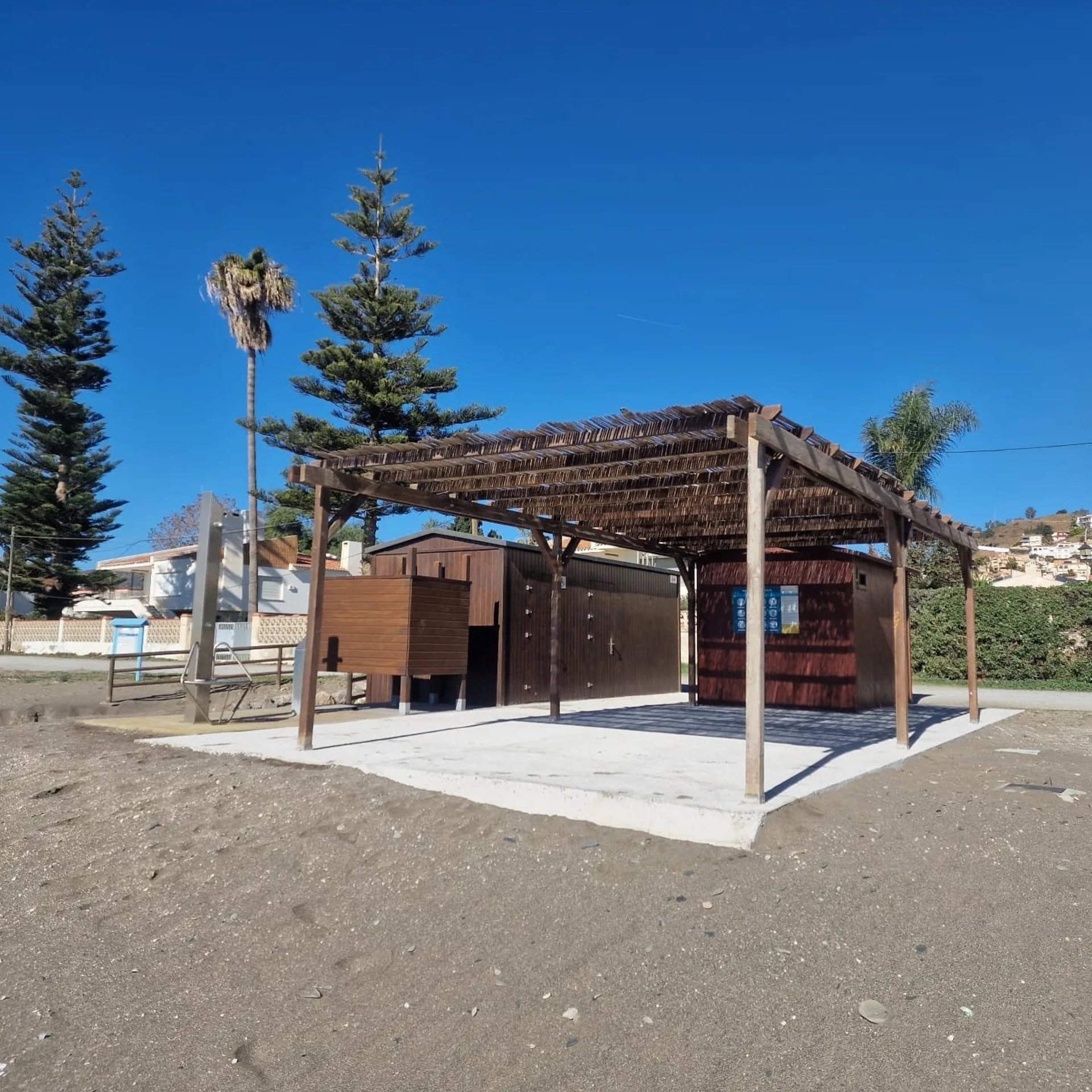 Además de la colocación del nuevo módulo, la modificación del Punto Accesible de Torre de Benagalbón ha consistido en la carga y transporte de las casetas, el desmontaje de ducha y cambiador, levantado y hormigueado de las plataformas, desmontaje y montaje de las pérgolas y mesas, extendido y nivelación del terreno, trabajos de saneamiento y electricidad, así como la colocación de los módulos en la nueva ubicación.