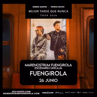 Marenostrum Fuengirola (Málaga) confirma una de las actuaciones más esperadas del próximo año con Romeo Santos y Prince Royce en su gira europea "Mejor Tarde que Nunca", el 26 de junio en el escenario principal Unicaja. Los dos nombres más influyentes y determinantes de la bachata y la música latina girarán por primera vez, convirtiendo este evento en un acontecimiento sin precedentes para el género y el público europeo.