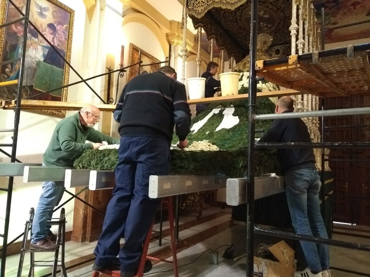 El pasado domingo se llevó a cabo la colocación de las plantillas sobre el fondo del manto verde del ciprés. Finalmente, a lo largo la jornada del Lunes Santo se realizó el empalillado del verde y las flores. El manto ha sido pulverizado al completo para su mejor mantenimiento antes de la procesión.