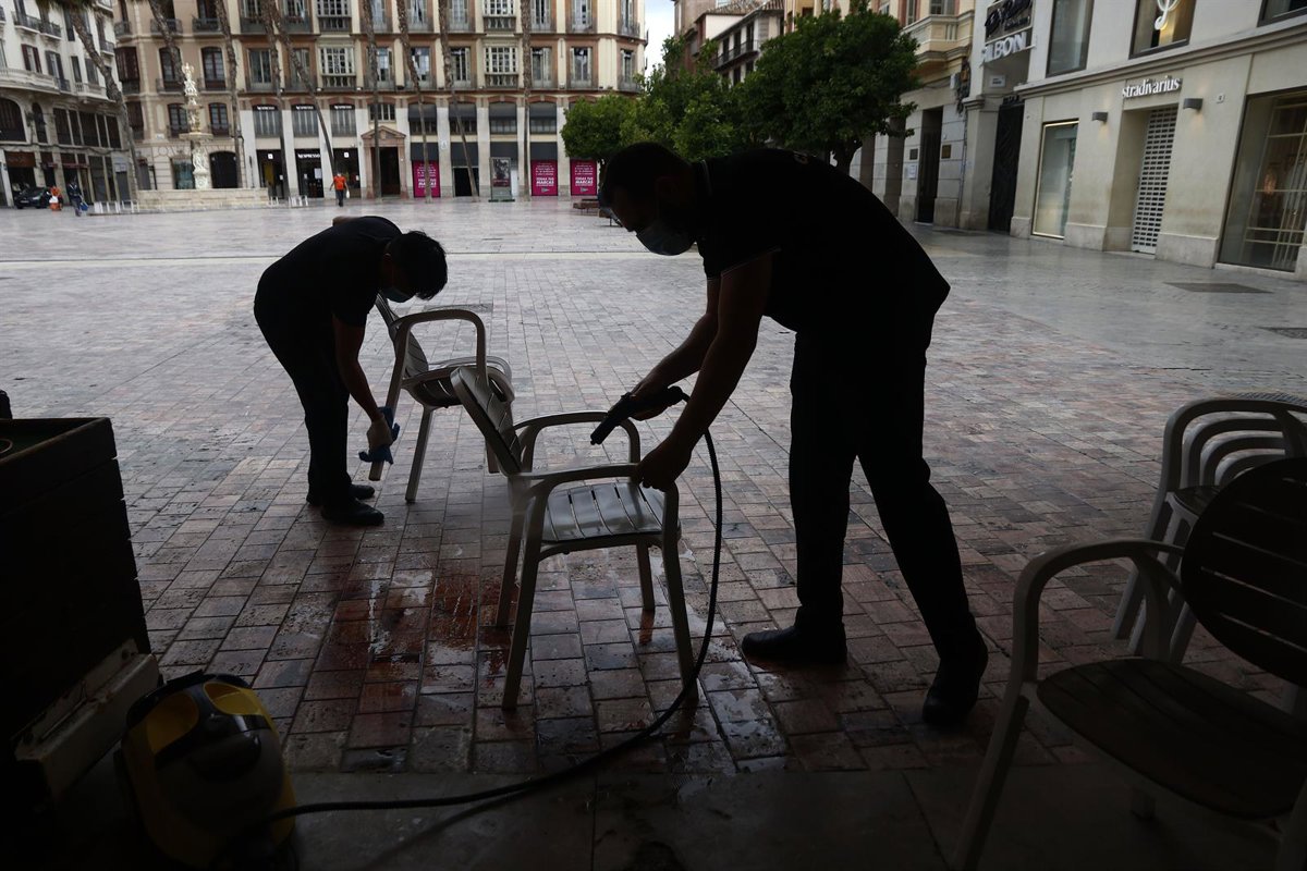 Trabajadores de la cafetería Central ubicada en la Plaza de La Constitución, en Málaga se afanan en la limpieza de los enseres de la terraza en caso de poder abrir el lunes 18 de mayo (Málaga a 20 de mayo del 2020) - Álex Zea - Europa Press