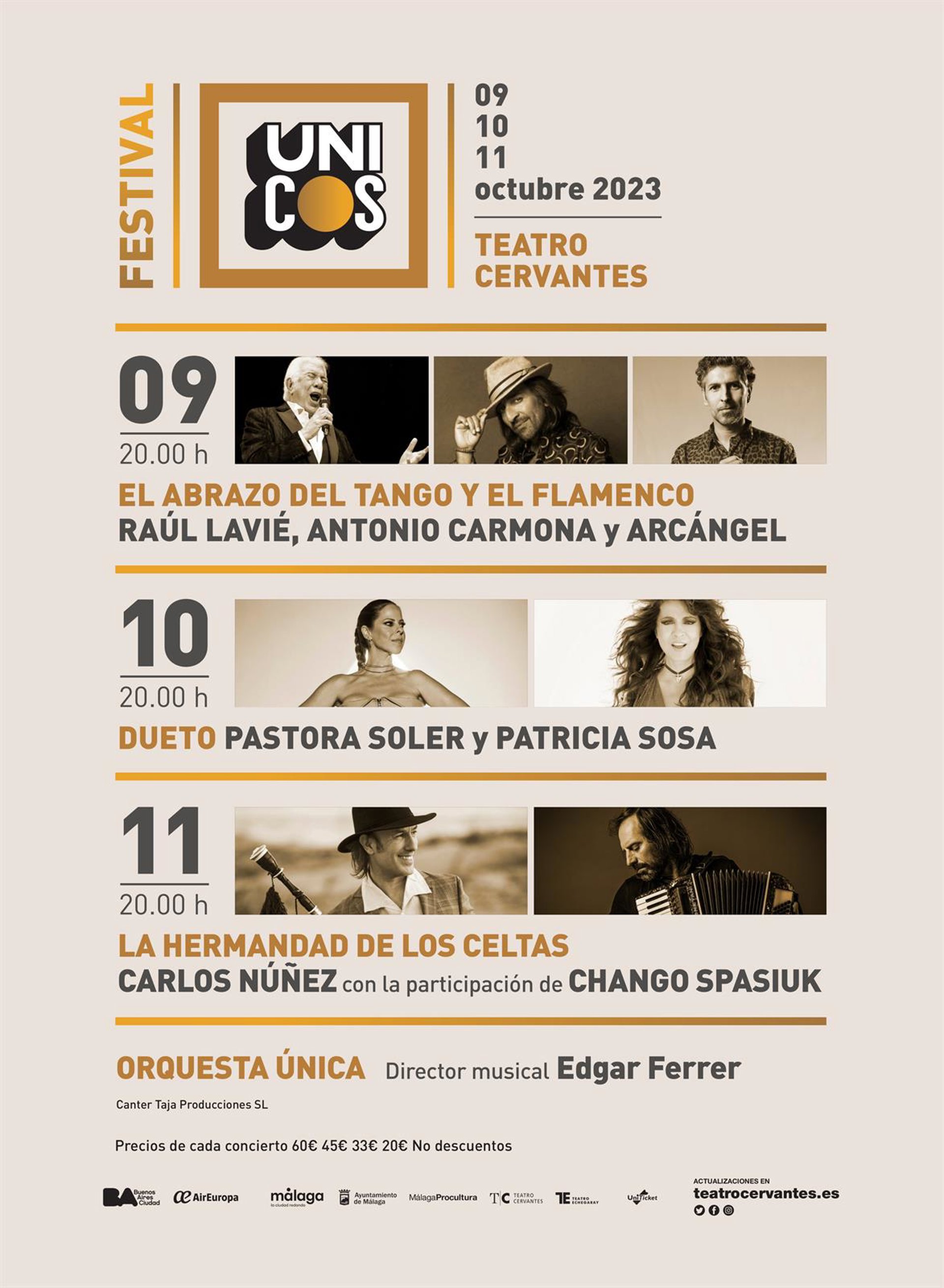 A este comienzo de curso escénico se le sumará en octubre el Festival Únicos, en cuyo original formato están representados los diferentes géneros musicales, con sus mejores intérpretes, con el soporte de una orquesta sinfónica, y que tras visitar el Teatro Colón de Buenos Aires o el Teatro Real de Madrid llega ahora al Teatro Cervantes.