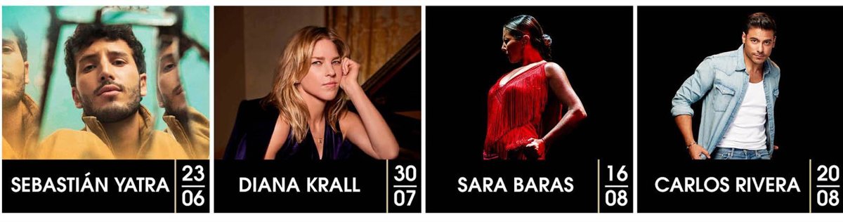 Las actuaciones de Sebastián Yatra, Diana Krall, Sara Baras y Carlos Rivera vienen a sumarse al cartel de estrellas de Starlite Catalana Occidente 2022 integrado hasta la fecha por C. Tangana, Vanesa Martín, Calamaro, Il Divo, Raphael, Sergio Dalma, Alan Parsons Live Project, Nile Rodgers & Chic, Maluma, Jason Derulo, Lionel Richie, Leiva, Simple Minds, Passenger, Andrea Bocelli, Estrella Morente & Israel Fernández & Kiki Morente, Hombres G, Malú, Jessie J, Estopa, Dani Martín y Ana Torroja, entre otros.