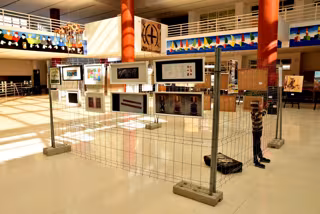 Las obras cuelgan de los cuatro lados de una estructura de metal que representa una valla en la que se ha dispuesto una imagen de un niño refugiado con una maleta vieja a sus pies, según ha indicado Rafael Fernández, voluntario de Málaga Acoge que colabora en la organización de la muestra.