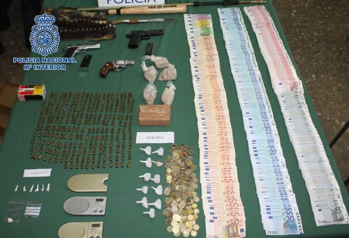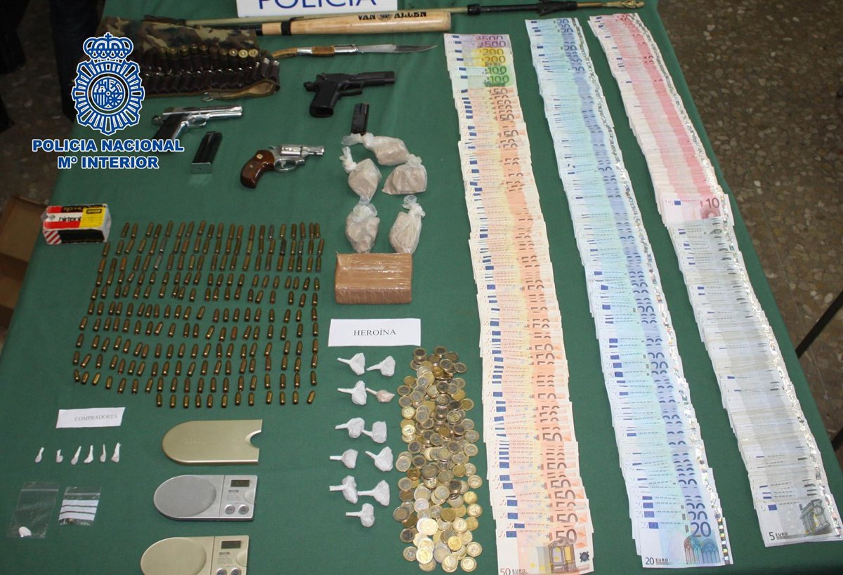 En los registros se localizaron 1.100 gramos de heroína en roca de gran pureza, así como varias papelinas listas para su distribución. Además, los policías se incautaron de dos pistolas del calibre nueve milímetros parabellum y un revólver del calibre 38, así como de 229 cartuchos para pistola y otros 26 para escopeta.
