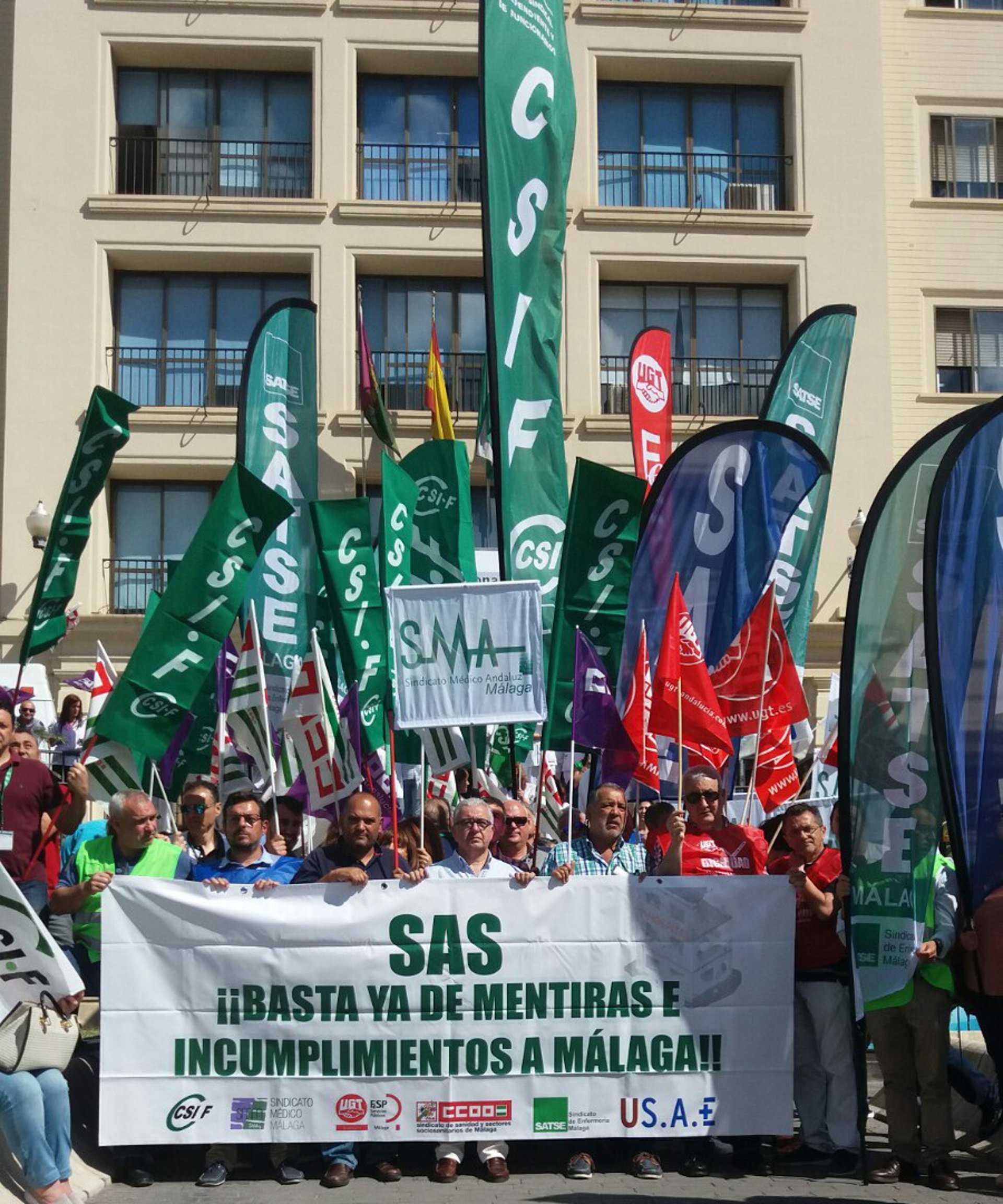 La Plataforma por la Dignidad de la Sanidad Pública Malagueña, formada por CSIF, CCOO, UGT, SATSE, SM y USAE, se ha concentrado este miércoles para "denunciar el trato denigrante que, en temas sanitarios, recibe la provincia", ha dicho el presidente del Sindicato Médico de Málaga, Antonio Martín Noblejas, quien también ha calificado de "vergüenza" la cantidad de contratos que el Servicio Andaluz de Salud (SAS) trata de hacer este verano para sustituciones médicas.