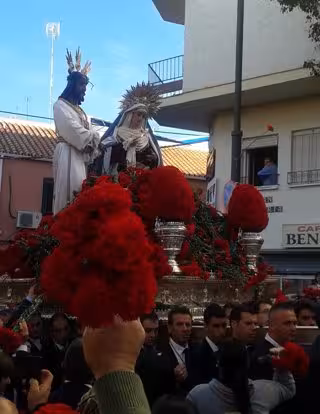 Durante el recorrido, entre saeta y saeta, piropos y 'vivas' al Cautivo y la Trinidad, los malagueños han lanzado miles de claveles rojos al paso del pequeño trono.