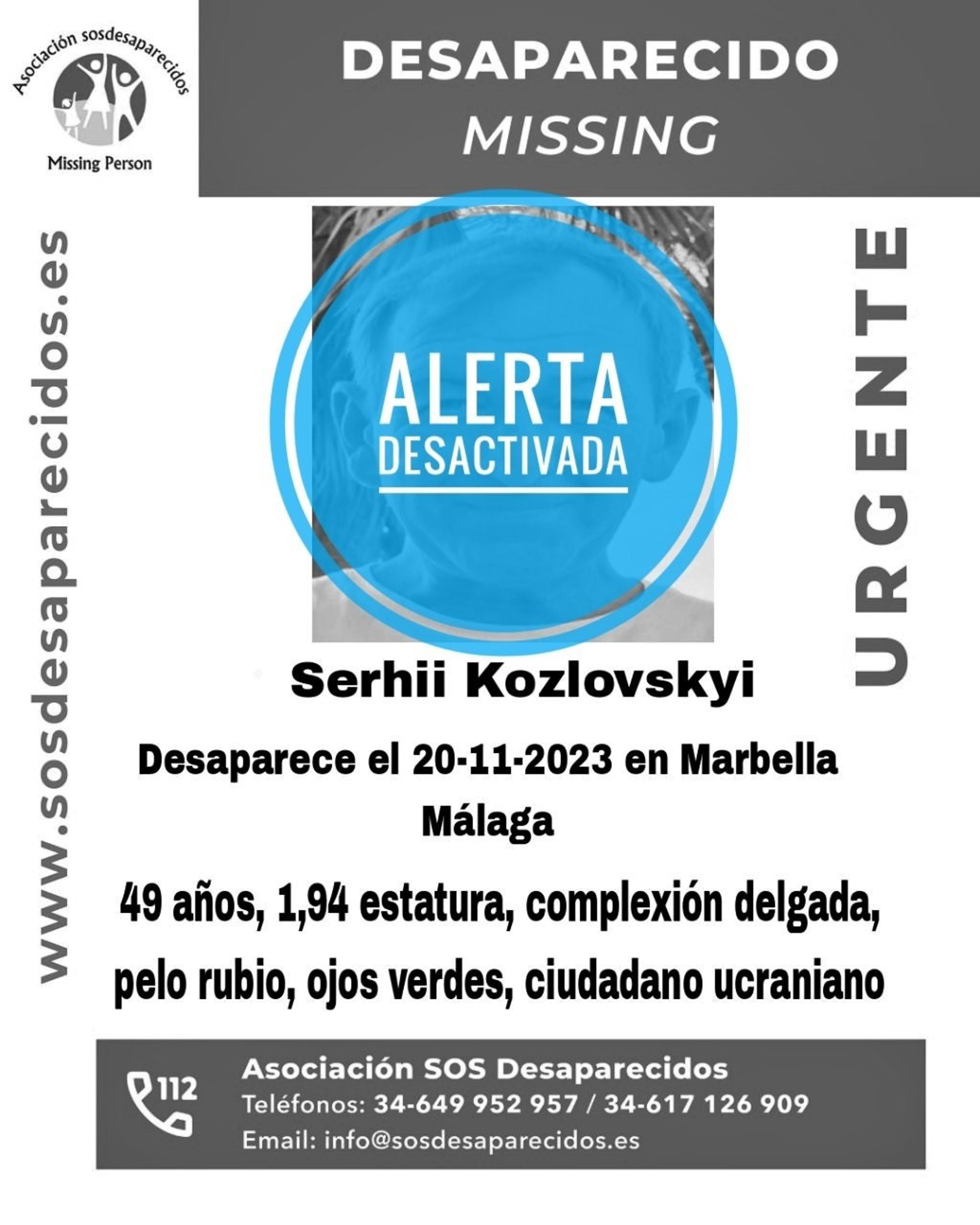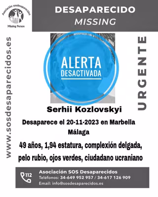 La Asociación SOS Desaparecidos ha desactivado la alerta de búsqueda que permanecía activa tras la desaparición de un ciudadano ucraniano en Marbella (Málaga), el pasado 20 de noviembre.