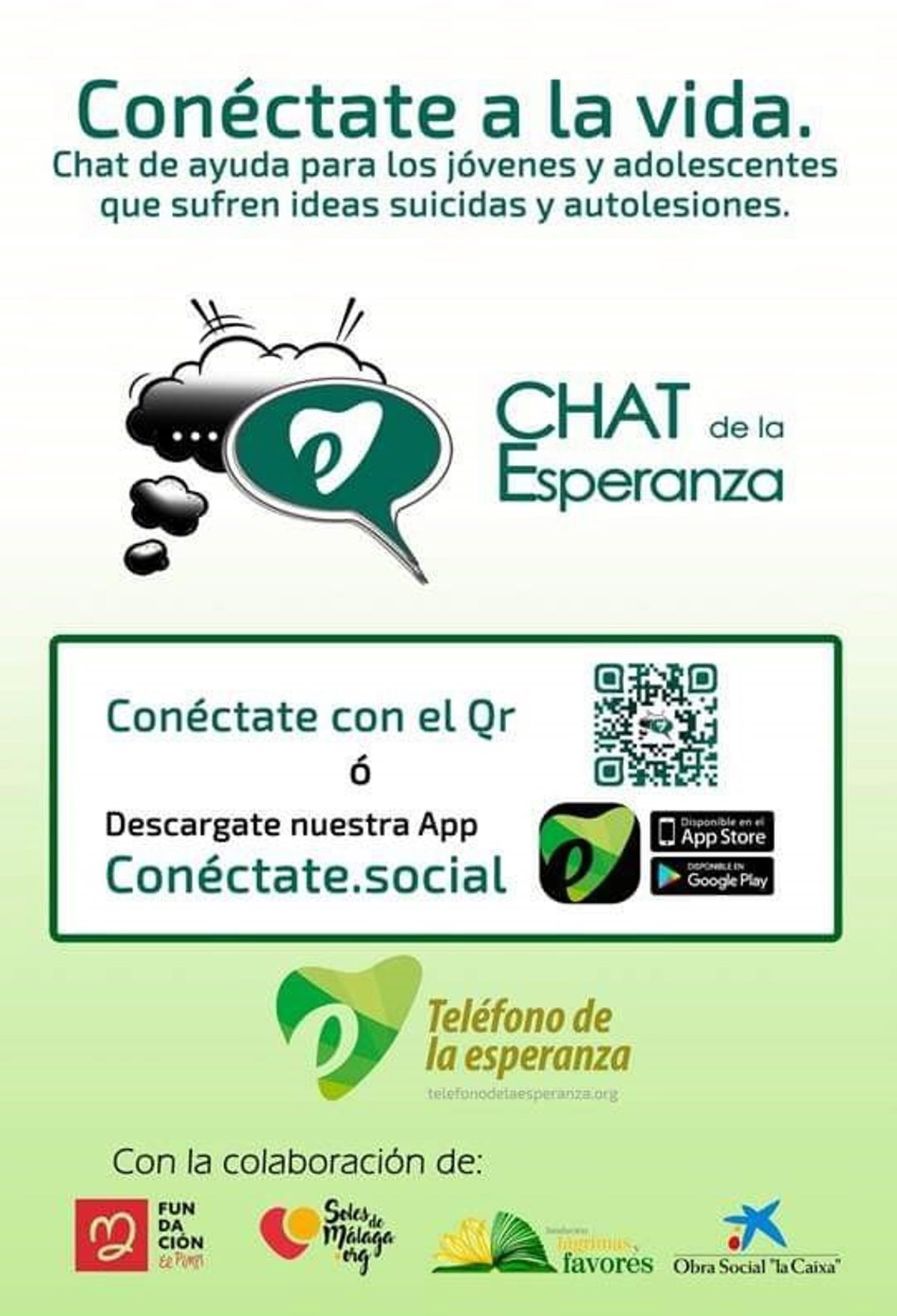 'El Chat de la Esperanza' es un programa piloto que comenzó a funcionar en marzo solo en Málaga, pero con vocación de extenderse a todas las sedes de la asociación. Los usuarios acceden a la web https://www.telefonodelaesperanza.org/malaga/whatsapp-telefo... y a través de la app Conéctate.social que se puede descargar en Google Play y Apple Store.