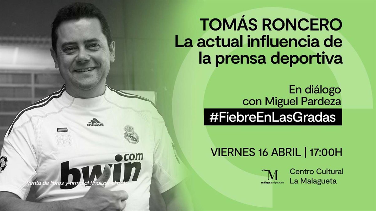 Tomás Roncero estará junto al escritor y exfutbolista Miguel Pardeza este viernes 16, en el ciclo 'Fiebre en las gradas' para hablar sobre la situación actual de la prensa deportiva. Como exponente mediático y colaborador de programas de radio y prensa deportiva española, Roncero tratará junto a Pardeza de establecer las claves que marcarán la información sobre el deporte en el presente y futuro.