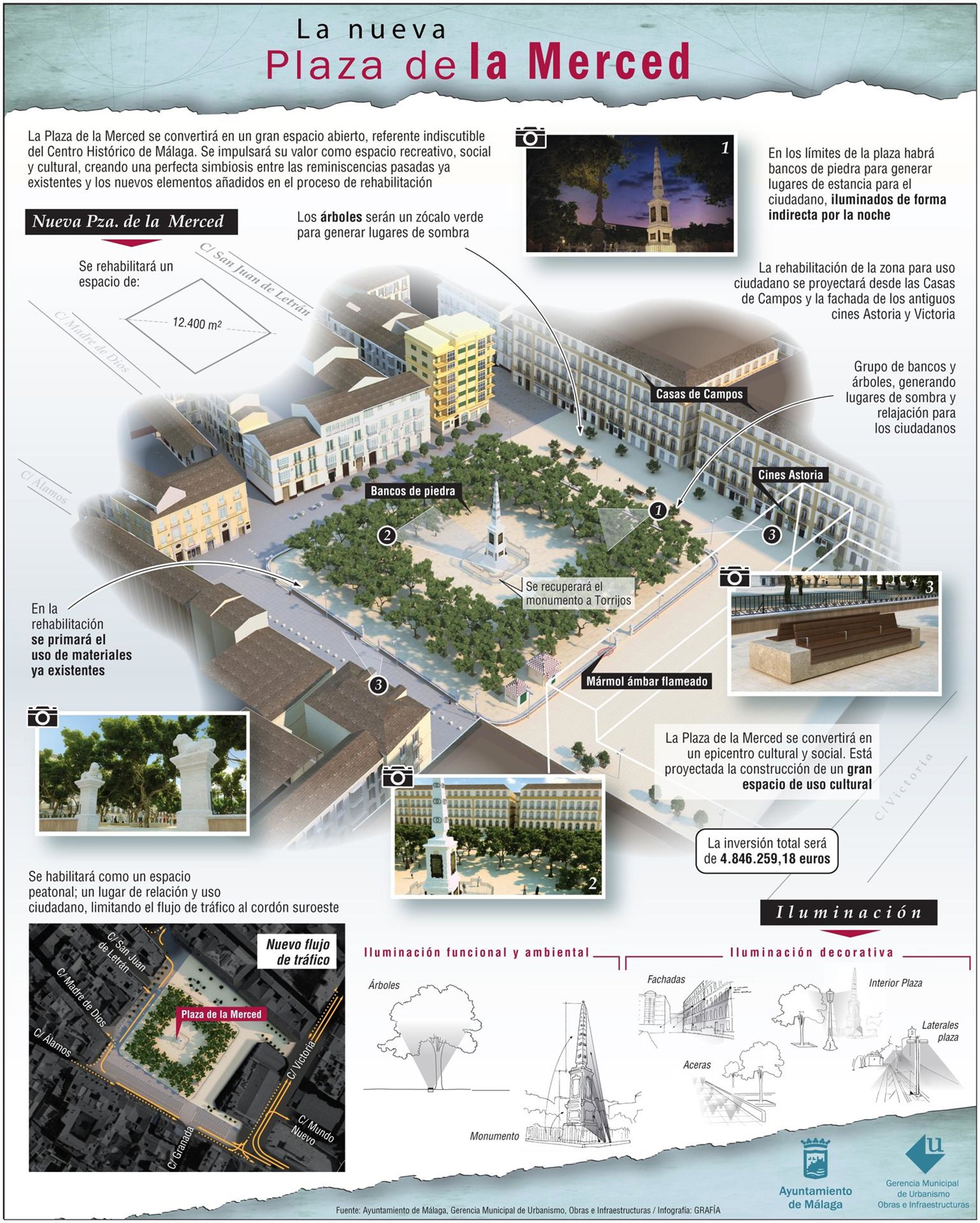 La contratación de los trabajos de rehabilitación de la plaza, una de las principales apuestas del alcalde, Francisco de la Torre, para esta legislatura, se hará mediante procedimiento abierto, con un presupuesto de licitación que asciende a 4.846.259 euros. El plazo de ejecución está previsto que sea de seis meses, siendo el espacio de actuación de 12.400 metros cuadrados.