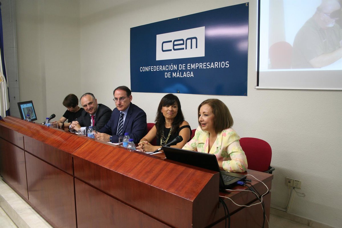 Durante el acto han intervenido el presidente de la Confederación de Empresarios de Málaga y Andalucía, Javier González de Lara, y el director territorial para Andalucía Oriental y Murcia de Caixabank, Juan Ignacio Zafra.
