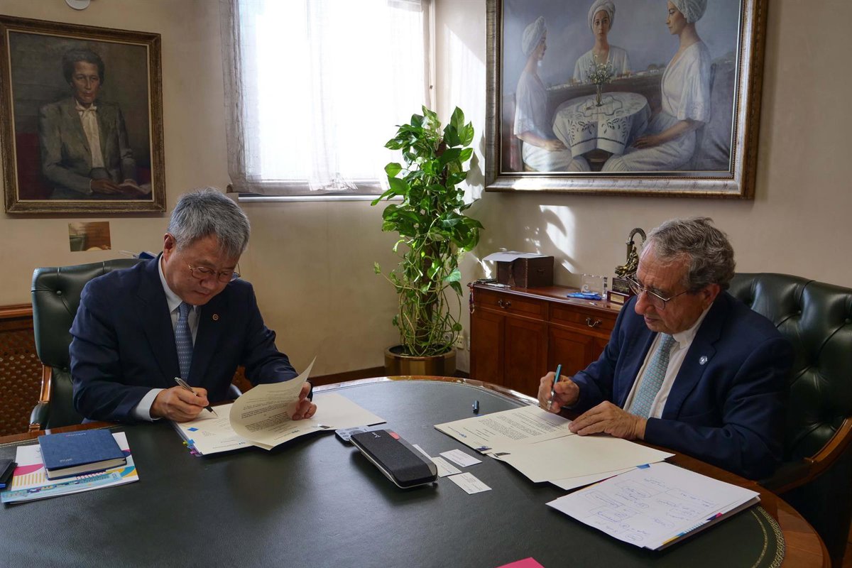 El rector de la Universidad de Málaga, José Ángel Narváez, y el presidente de la Universidad de Soongsil (Seúl, Corea del Sur), Beomsik Jang, suscriben un convenio - UMA