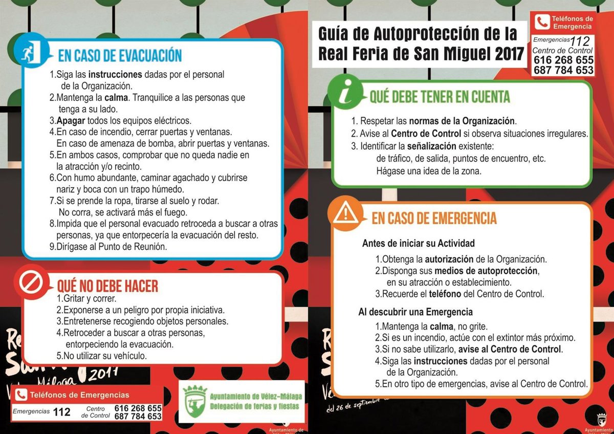 El responsable de Ferias y Fiestas ha indicado que en el folleto informativo, además del número de teléfono de emergencias 112, "están contemplados los números de los puestos de control". Según ha apuntado, el ciudadano encontrará en el folleto los pasos enumerados a seguir dependiendo de la situación que se estén viviendo, resumidos en los cuatro apartados: 'En caso de evacuación', 'Qué no debe hacer', 'Qué debe tener en cuenta' y 'En caso de emergencia'.