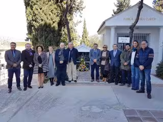 El alcalde de Vélez-Málaga y presidente de la Fundación María Zambrano, Antonio Moreno Ferrer; la concejala de Cultura del Ayuntamiento, Cynthia García; el delegado del Gobierno andaluz en Málaga, José Luis Ruiz Espejo; el diputado de Sostenibilidad, Francisco Delgado Bonilla; y el director de la Fundación, Antonio Garrido Moraga, junto con miembros de la Corporación municipal han asistido este lunes a la tumba de la pensadora y filósofa, en el cementerio de esta localidad, para hacer una ofrenda florar en el 26 aniversario de su muerte.