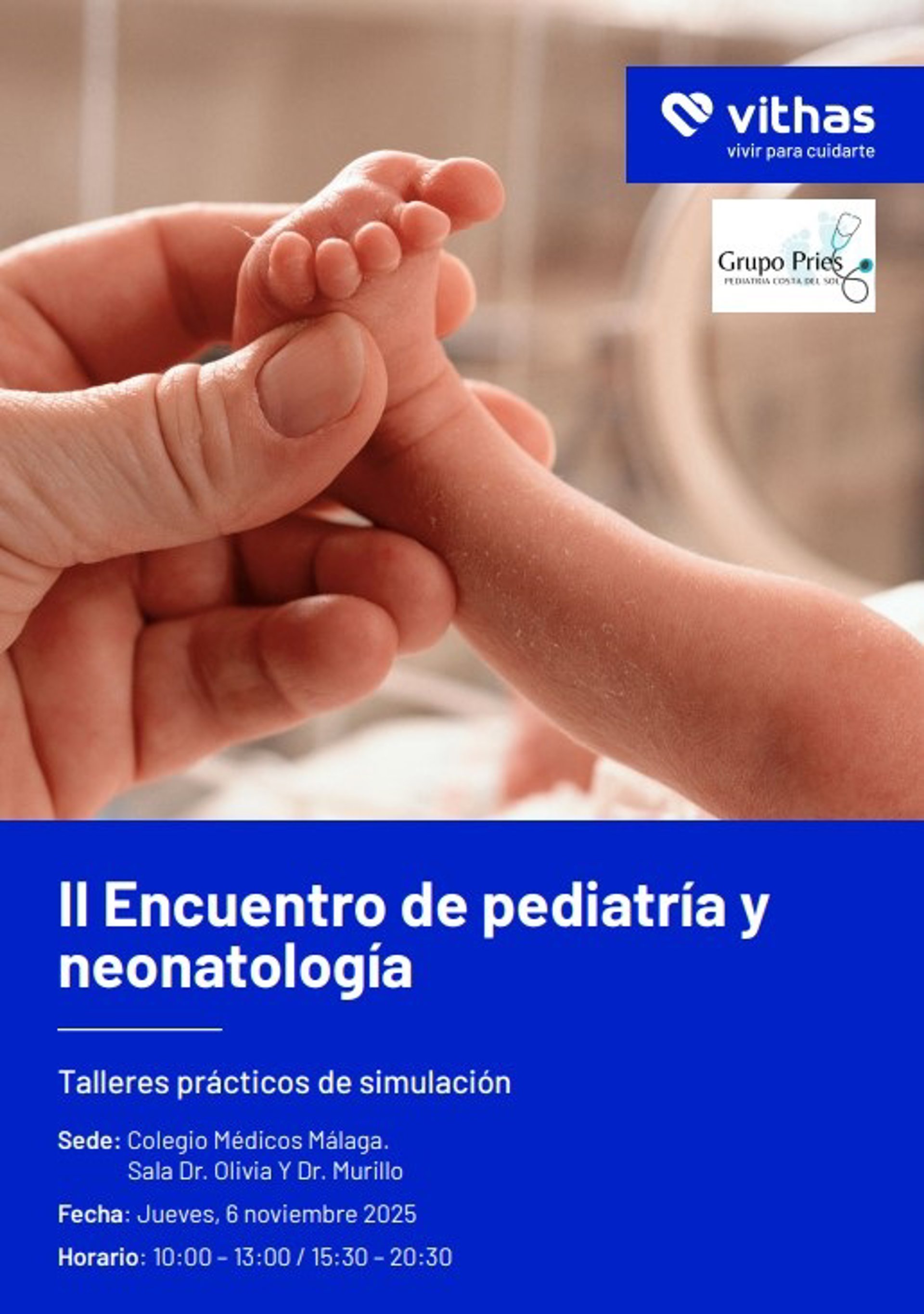 El Colegio de Médicos de Málaga será el próximo jueves, 6 de noviembre, el escenario del II Encuentro de Pediatría y Neonatología, organizado por el Vithas y el Grupo Pries. Una jornada que tiene como objetivos actualizar conocimientos en neonatología y pediatría, compartir experiencias clínicas y fomentar la formación práctica en un entorno multidisciplinar, contando con la participación de expertos de distintos hospitales y profesionales externos.