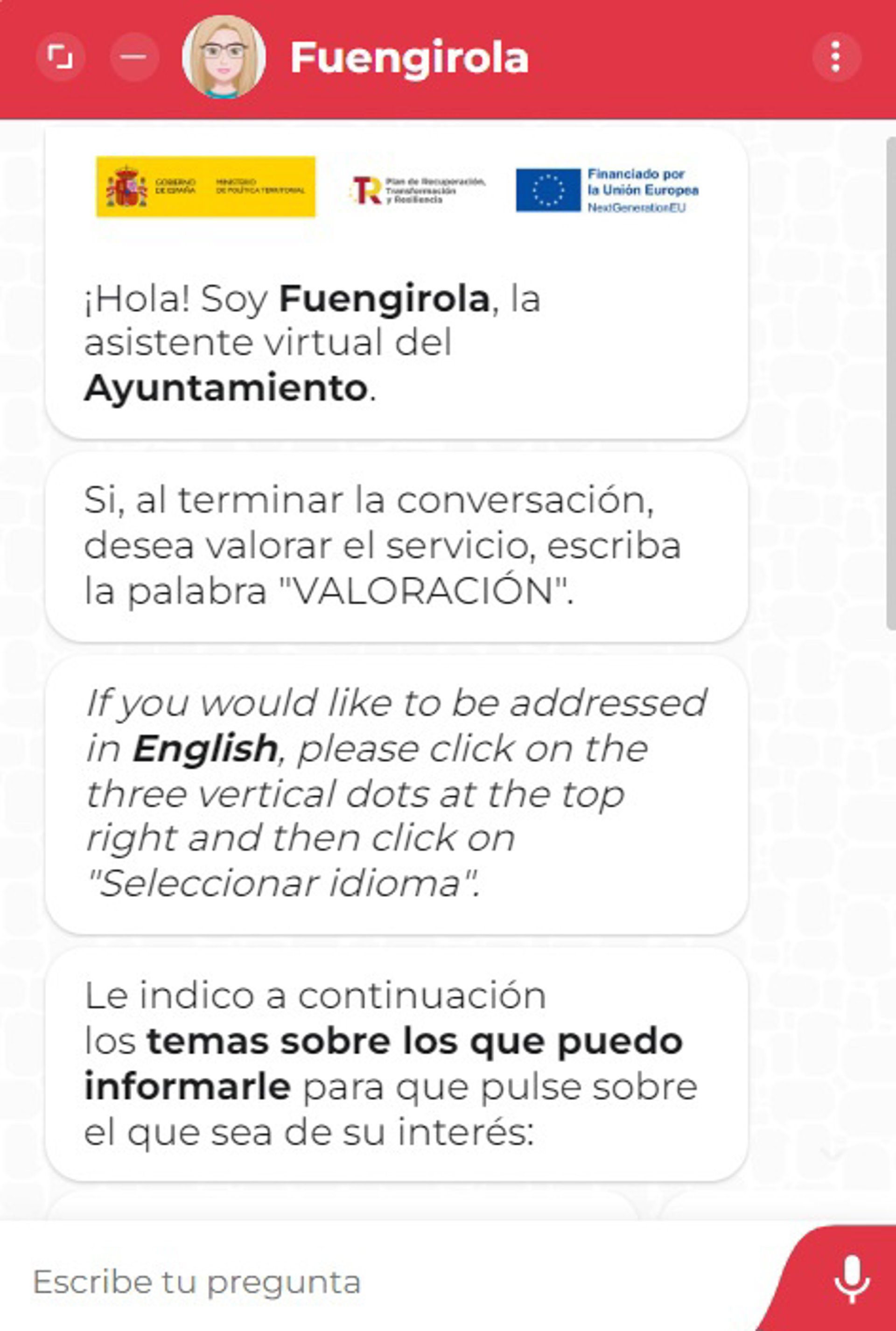 Vodafone ha desarrollado en el portal web del Ayuntamiento de Fuengirola (Mlaga) una nueva herramienta para potenciar la comunicación de la institución con la ciudadanía. Se trata de un asistente virtual que integra inteligencia artificial, aprendizaje automático y reconocimiento del lenguaje natural, lo que permite la automatización de respuestas a consultas o preguntas recurrentes de los ciudadanos, así como dirigir las consultas que requieran de la atención de un especialista al área o servicio correcto del Ayuntamiento.